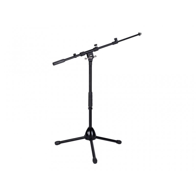 Soporte para micrófono con barra de jirafa. Palomillas de fijación. Base desplegable. Metálico. Acabado en negro.