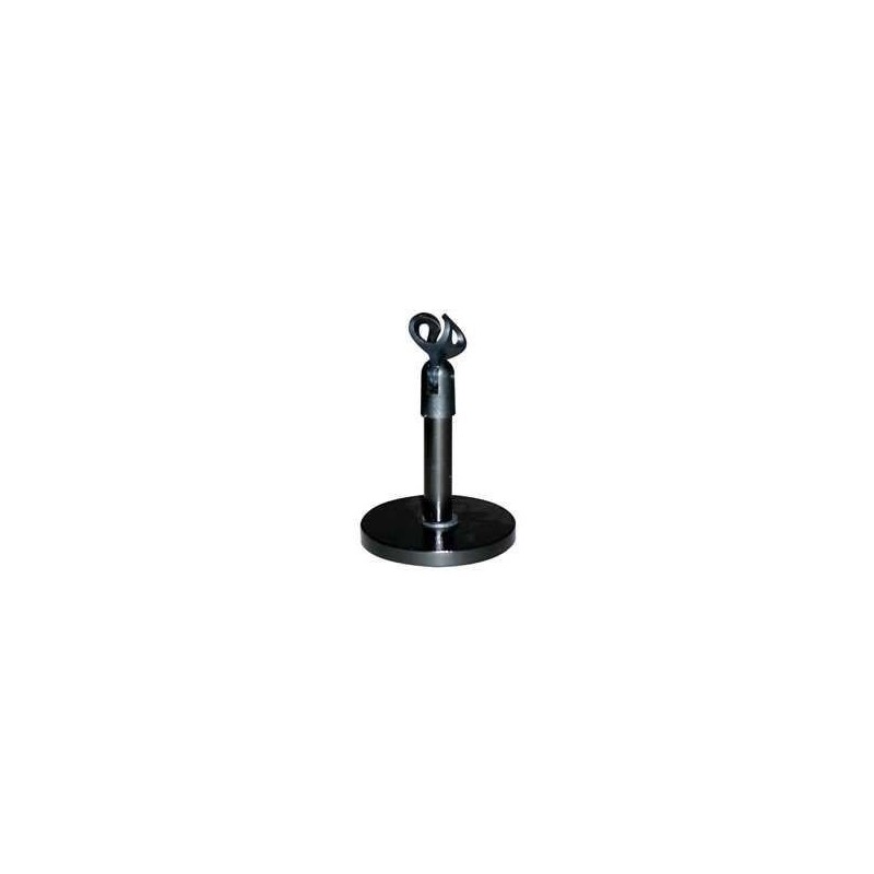 Pie de micro de sobremesa. Incluye pinza para micro reforzada y elástica ref. PZ-01. Su base metálica (Ø 11 cm) garantiza una máxima estabilidad. Ésta incluye protectores para no dañar la superficie. Desmontable. Acabado en pintura negra texturada antirralladura.