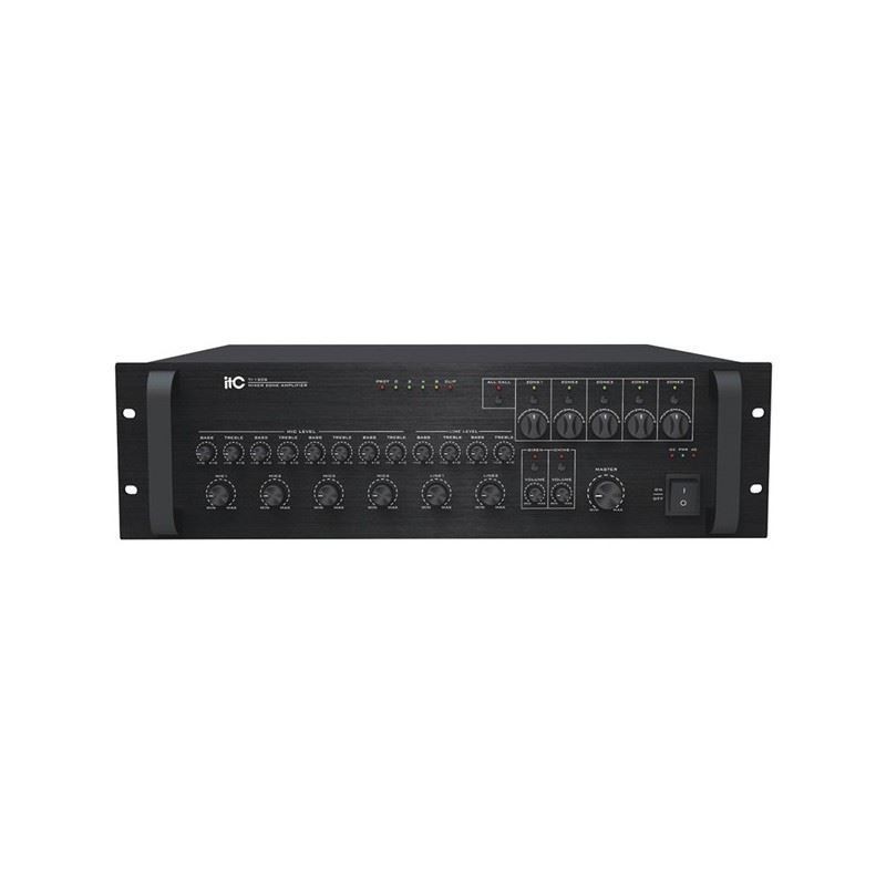 La serie de amplificadores de 5 zonas TI-S permiten ser montados en armario rack ocupando sólo 3U. Permiten la conexión de altavoces en línea de 70V, 100V y baja impedancia de entre 4 y 16 ohmios. Ofrece 4 entradas de micrófono combinadas XLR / Jack 6,35 mm. y 2 entradas de línea con conectores RCA. El volumen de cada una de las 5 salidas de zona del amplificador puede ser ajustado individualmente, lo que permite una elevada flexibilidad de ajustes. Cada una de las entradas de audio está equipada con ajustes de graves y agudos. El pupitre microfónico de sobremesa modelo T-318 debe ser utilizado en las instalaciones donde se precisa emisión de avisos con selección de zona. Incluye protecciones contra corto circuito, sobrecarga y protección térmica.