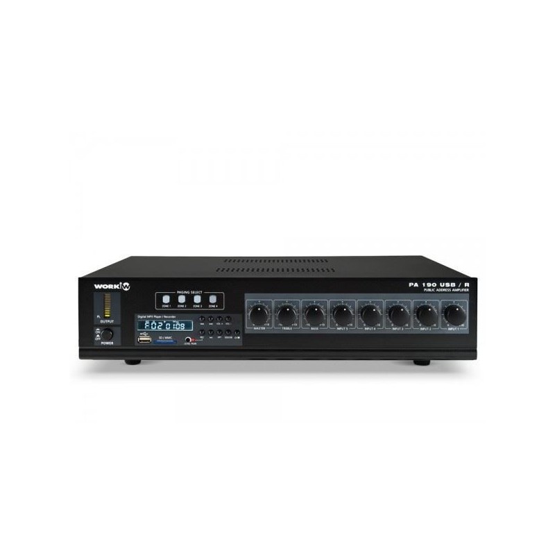 PA 190 USB/R consta de 9 fuentes de entradas: 4 Mic/Line seleccionables, 1 Aux/CD/Tuner/tape. El mezclador incorporado permite el control independiente de volumen, el control Master y la tonalidad agudos/graves. El mezclador también tiene Pre-out para el envío de la señal mezclada a un sistema de amplificación externo o para el conexionado de dispositivos externos como ecualizadores, procesadores, etc. Pensado para instalaciones de sonido distribuido, puede ser utilizado con altavoces de baja impedancia (4, 8 y 16 ohm) y con salidas de 25, 70 y 100 V (Line). Su salida de monitor amplificada resulta muy útil para la gestión del audio desde una sala de control.
